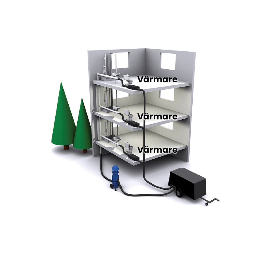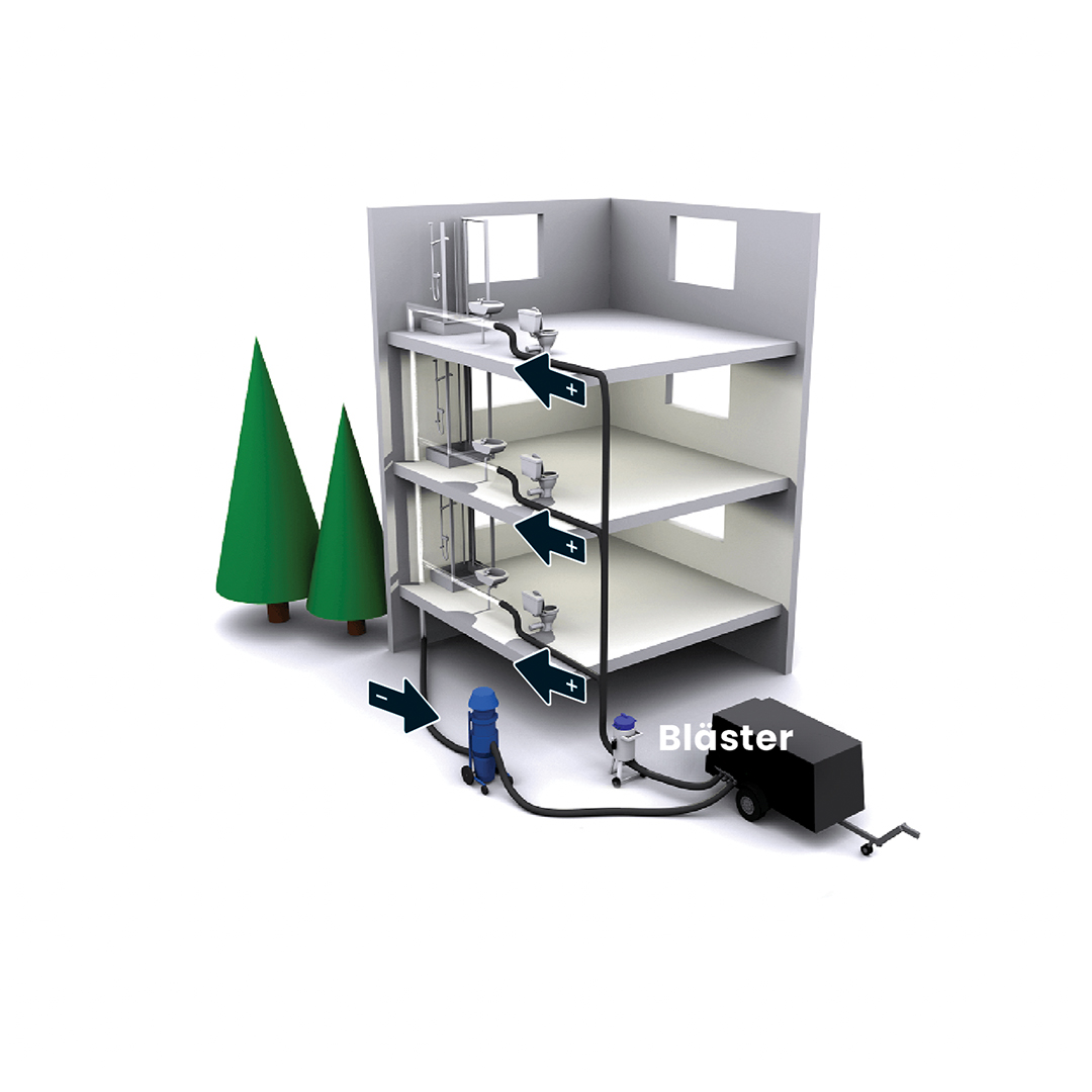 HWQ etablerar sig på plats, får nycklar till alla lägenheter, lägger ut skyddsmattor, fyller på vattendunkar och stänger därefter av varm och kallvattnet. Rör kopplas ur i markplan där inkommande stam går upp och likaså i respektive lägenhet. Därefter filmas rören för att dokumentera rörens kondition innan torkning och rengöring sker med hjälp av tryckluft och blästermedel.